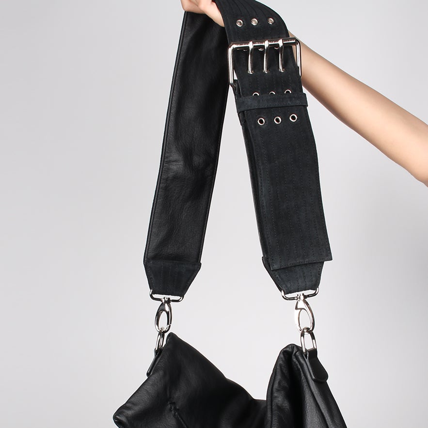 • Leather body, suede adjustable strap